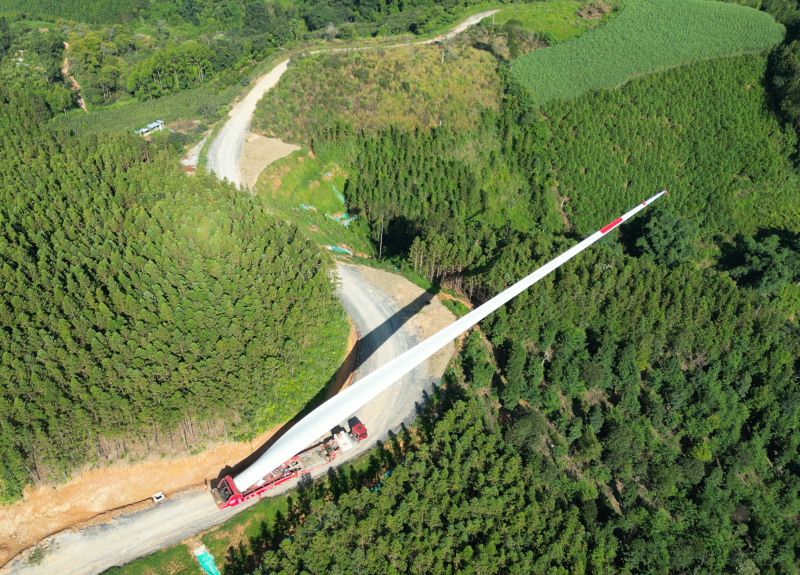 前方,一輛輛裝載著超長(zhǎng)風(fēng)機(jī)葉片的大型運(yùn)輸車緩緩向山脊攀升,頭戴安全帽、身穿反光背心的建設(shè)者們?cè)诼房谀踔笓],前車開道、后車收尾,人與車的身影與蔥蘢山色相映成趣,奏響了深山運(yùn)輸?shù)膮f(xié)作之歌。